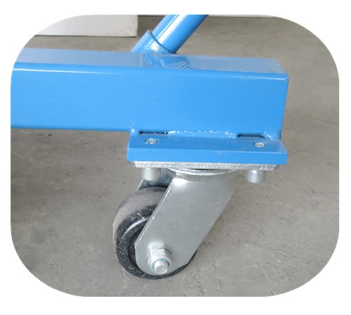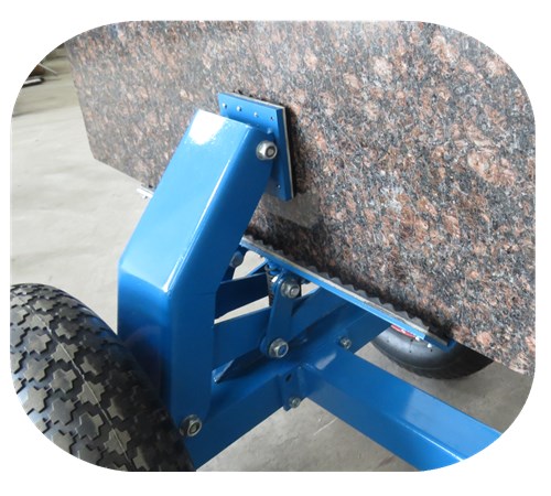 Slab carrying trolley with vulcanized rubber on the bottom, sides, and top to avoid chipping the edges of finished workpieces. It is an ideal tool for moving slabs on rough ground and building sites.